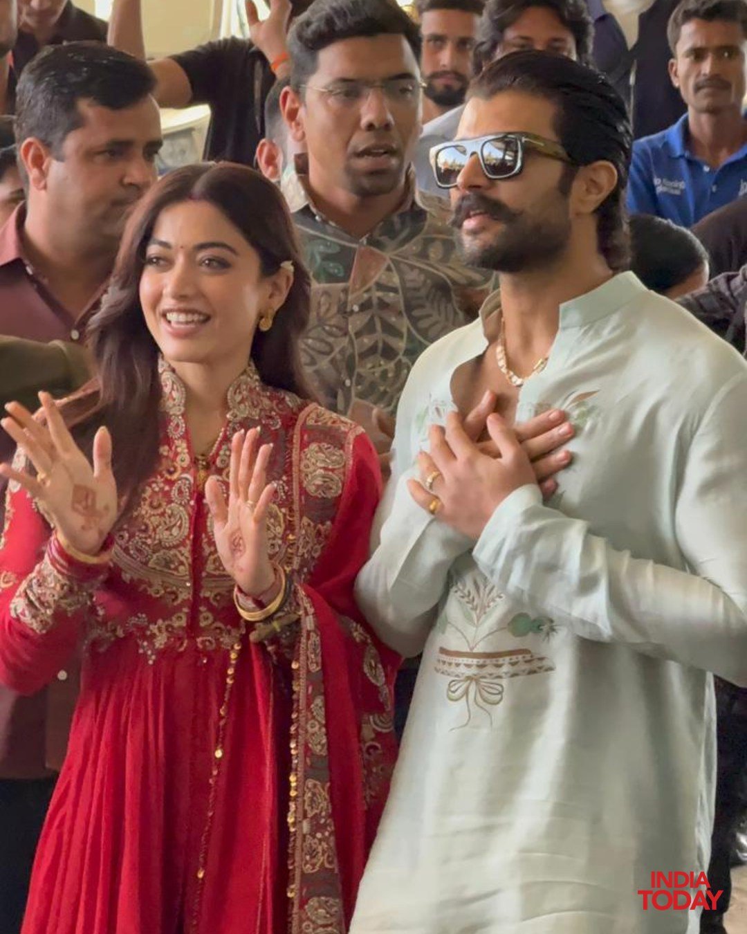 रश्मिका ने हल्के गुलाबी रंग की साड़ी पहनी थी, वहीं विजय सफेद कुर्ता-पायजामा में बेहद रॉयल लगे। दोनों ने हाथ जोड़कर सबका धन्यवाद किया और कैमरों की ओर प्यार से मुस्कान बिखेरी।